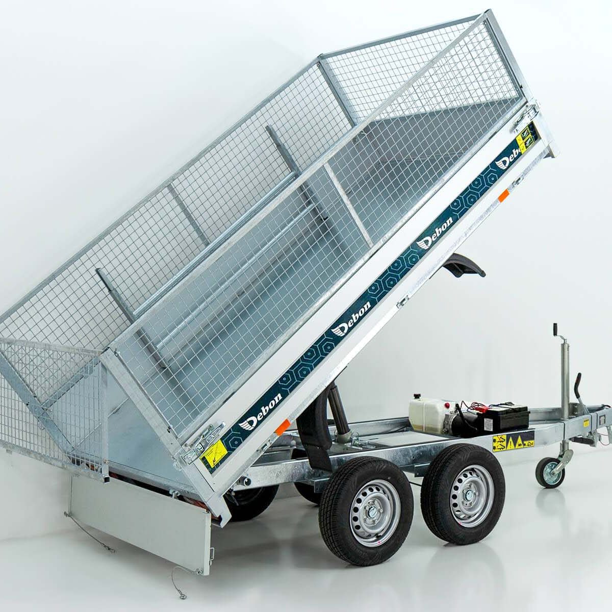 Einen stabilen 2-t Heckkippanhänger mit elektrischer Kippfunktion inklusive Gitteraufsatz.